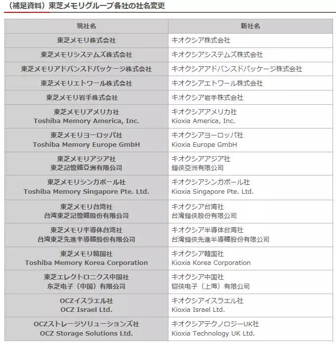 10月1日起,东芝存储器改名为Kioxia,相关子公司名称也相应更改。