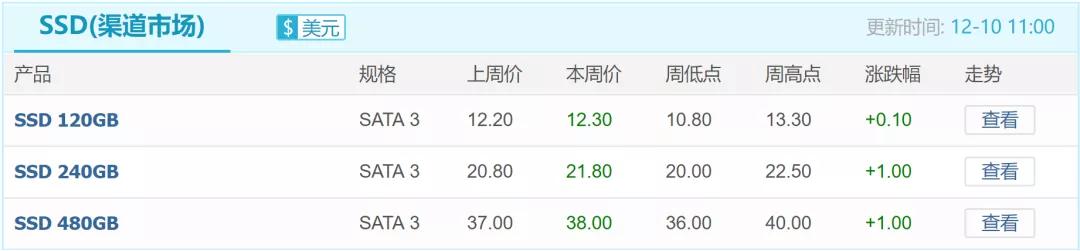 渠道市场SSD价格持续上涨,SSD SATA 240GB价格从20.8美金上涨至21.8美金,480GB价格从37美金上涨至38美金。