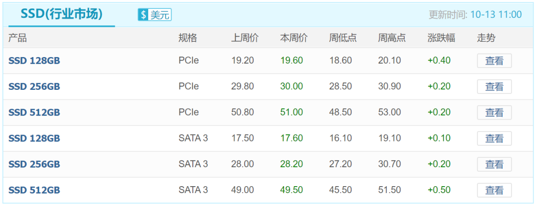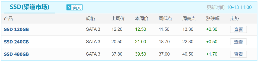 行业SSD市场稳健,延续上涨态势,自9月份累积涨幅超7%