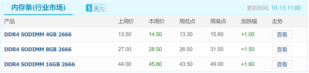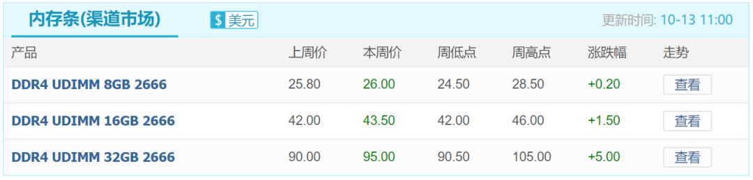 自9月份以来,大部分内存产品价格均保持上涨态势,截至本周,累计涨幅明显,其中DDR4 4Gb(512MbX8)累计涨幅达22%;DDR4 8Gb(1024MbX8)累计涨幅达11%;DDR4 16Gb(2048MbX8)累计涨幅达17%。渠道市场,DDR4 UDIMM 8GB 2666、DDR4 UDIMM 16GB 2666和DDR4 UDIMM 32GB 2666累计涨幅均达10%;行业市场DDR4 SODIMM 4GB 2666和DDR4 SODIMM 8GB 2666涨幅达16%;DDR4 SODIMM 16GB 2666涨幅也接近10%。